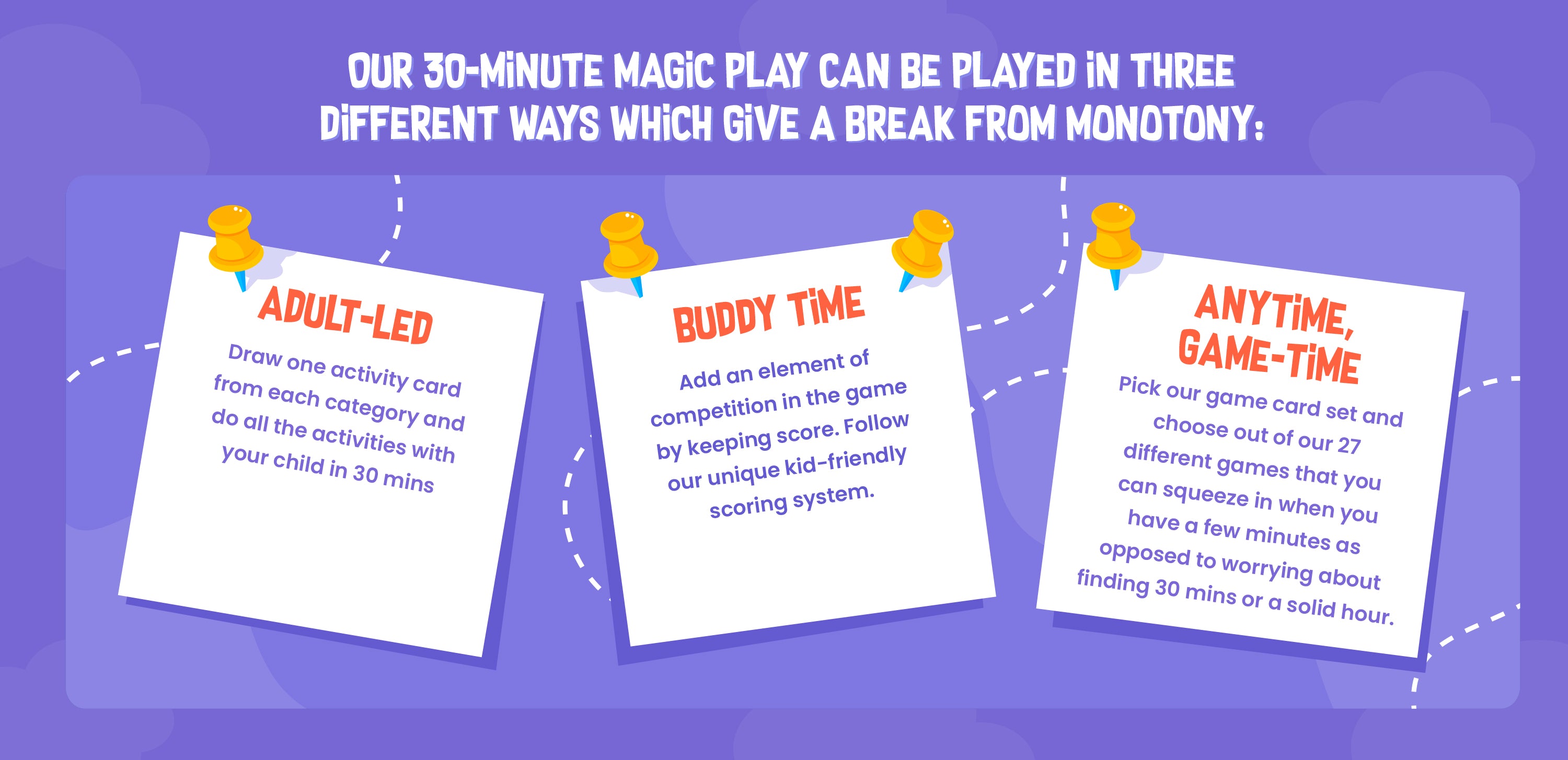Our game has more than 200 unique activities and three different ways to play which means more fun and no monotony.